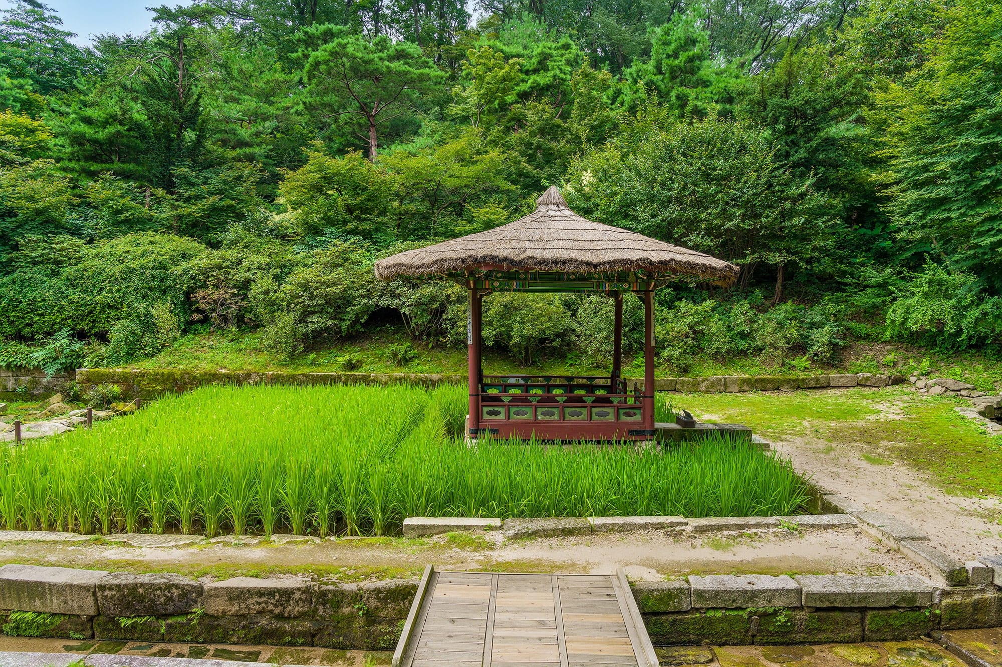 The Secret Garden of Changdeokgung features various types of pavilions with roofs in shapes like cross, hexagon, and square. Some roofs are uniquely made from woven rice straw, and the floors also come in diverse forms, including fan-shaped designs.